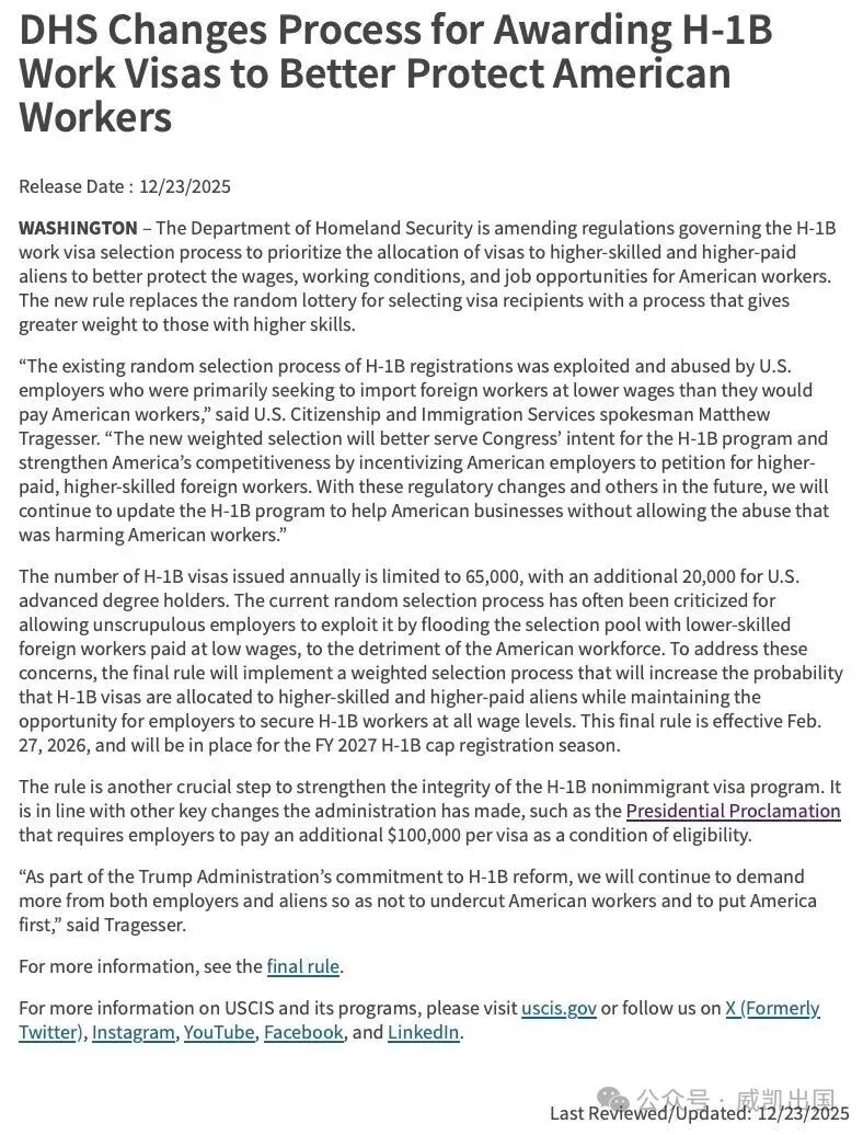 12月23日,官方正式确认一项重磅移民改革:H-1B签证选择机制将按工资水平加权抽签,2026年2月27日生效。2025年岁末,实施多年的H-1B【随机抽签制】落下帷幕,所有的在美留学生、职场人终于等到最后一只靴子落地。